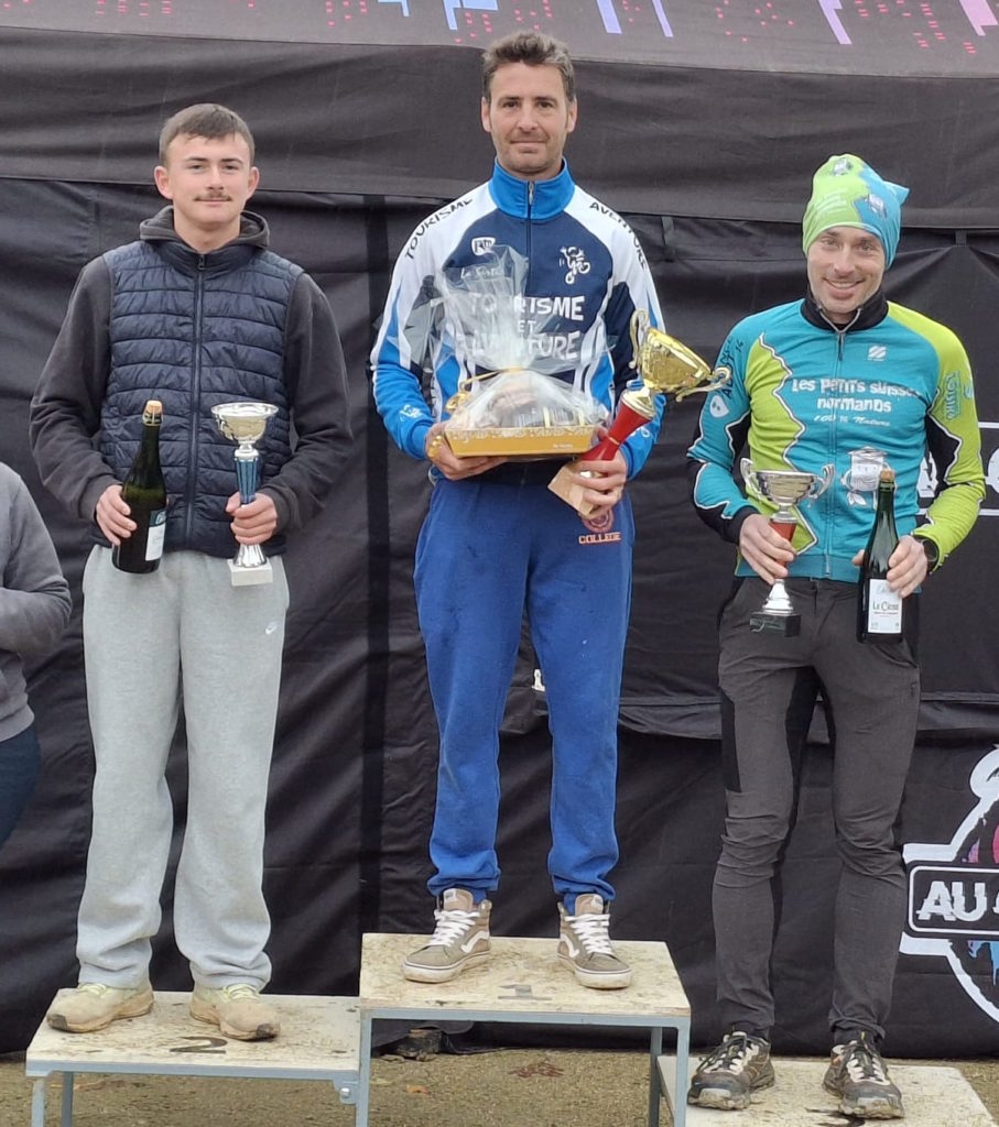 Transition rapide (je crois que je double 2 solos) et je repars en même temps qu’Anthony Avril (sa coéquipière est arrivée une quinzaine de secondes derrière moi, mais pas de changement de chaussures pour eux). Je n’essaie pas de le suivre, ça va beaucoup trop vite. Il remontera tout le monde et creusera des écarts importants (large victoire au scratch pour eux). Je retrouve de belles sensations sur le vélo et commence la remontée. 4-5 places de gagnées (dans le 1er tour), mais ensuite c’est difficile de s’y retrouver. Je double beaucoup, mais pas évident de savoir qui est dans le même tour que nous. Dommage que le speaker n’annonce pas les classements à chaque passage (alors que l’on a des puces et qu’il a l’écran à côté de lui). Bref, il faut appuyer fort sur les pédales et doubler un maximum. Dans le 4ème tour, je double un copain qui court en équipe. C’est plutôt bon signe … À la fin du 5ème tour, dans le bois, j’aperçois le jeune Timéo à une bonne minute devant moi (j’ignore s’il y a d’autres solos devant lui / il y en a bien un, Franck Tossen, un solide vététiste sarthois, que je n’aurai jamais vu de la course). Je reprends finalement Timéo à l’entrée du bois au 6ème et dernier tour. Je sais que malheureusement, cela ne suffira pas avec la dernière course à pied d’un peu plus de 2 km. J’essaie de creuser un peu l’écart quand même dans le bois. Un autre solo (David Hamel) est revenu juste derrière moi, mais il me dit que la course à pied n’est vraiment pas son fort.